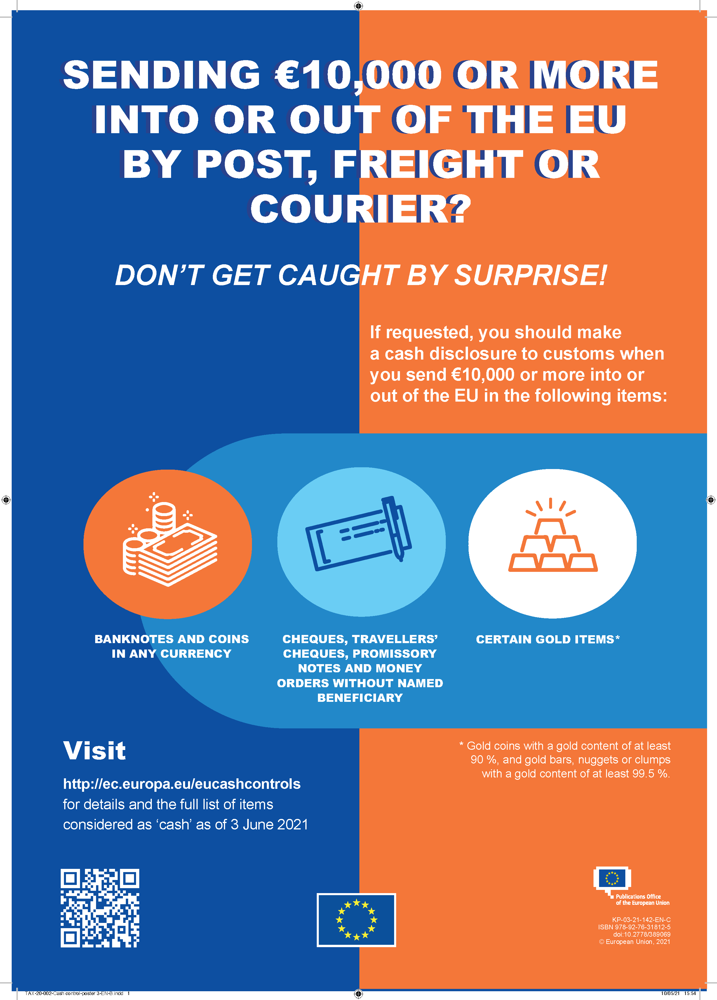 If you enter or leave the European Union (EU) with EUR 10 000 or more, or the equivalent amount in another currency, you must declare the cash to Customs.